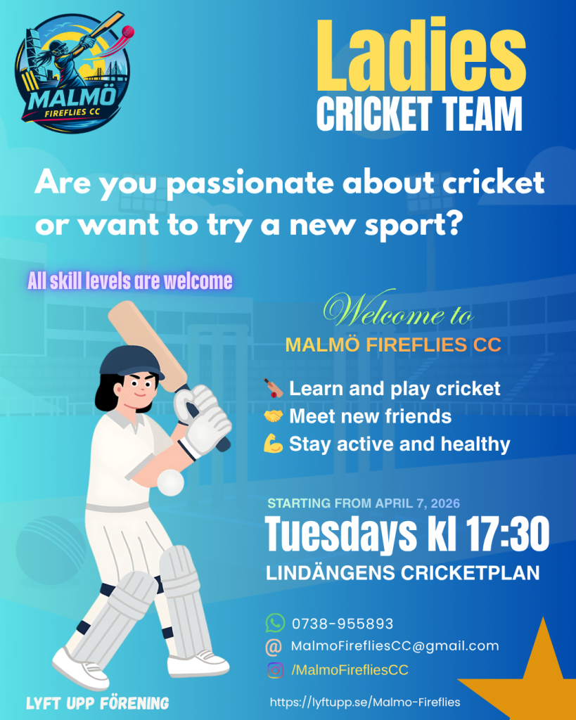 Malmö Fireflies CC invites all girls and women living near Malmö area to join our cricket training sessions, starting from April 2026.
